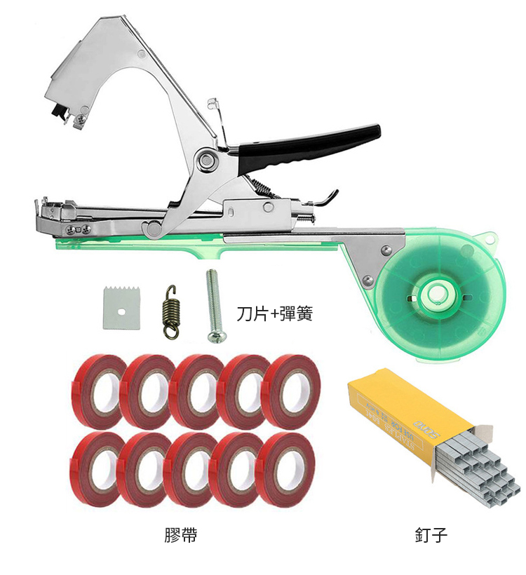 2分鐘前綁枝好幫手,綑綁省時省力 ?超高效率,只需2秒即完成綁枝 ?適用於番茄、黃瓜、葡萄、豆子、茄子等莖蔓類植物綑綁 - 【黑金剛綁枝機】+刀片+彈簧+40卷加厚膠帶+2盒釘(3萬枚 )